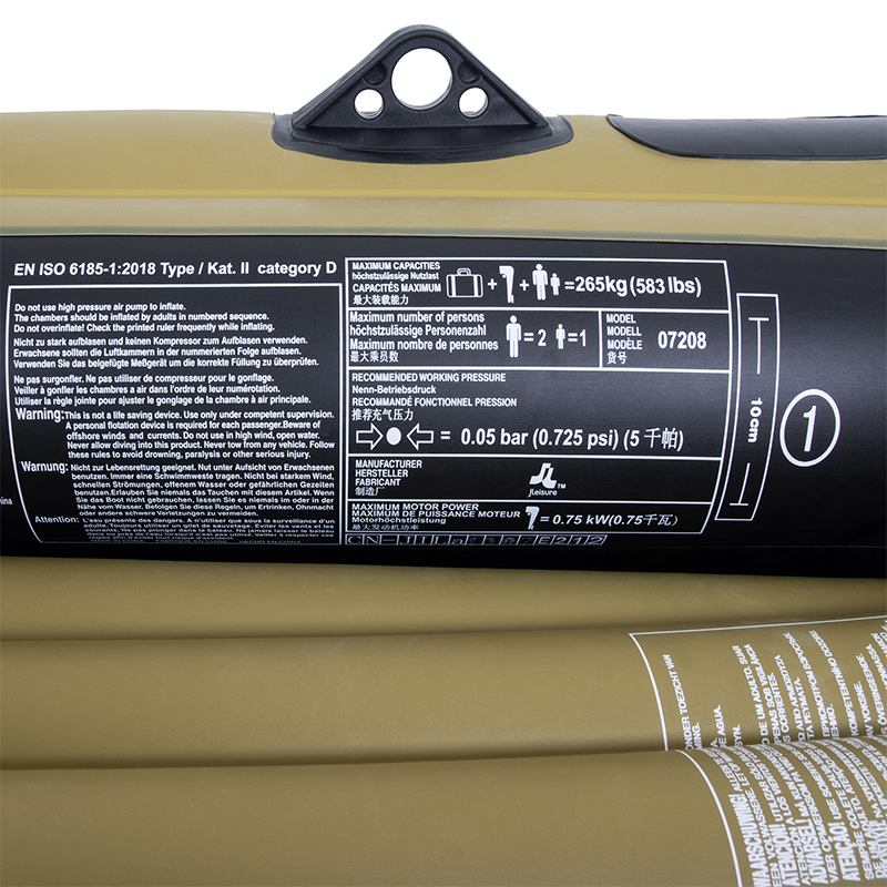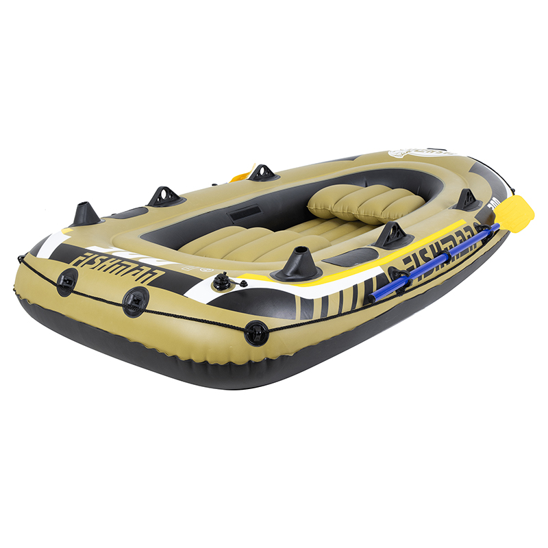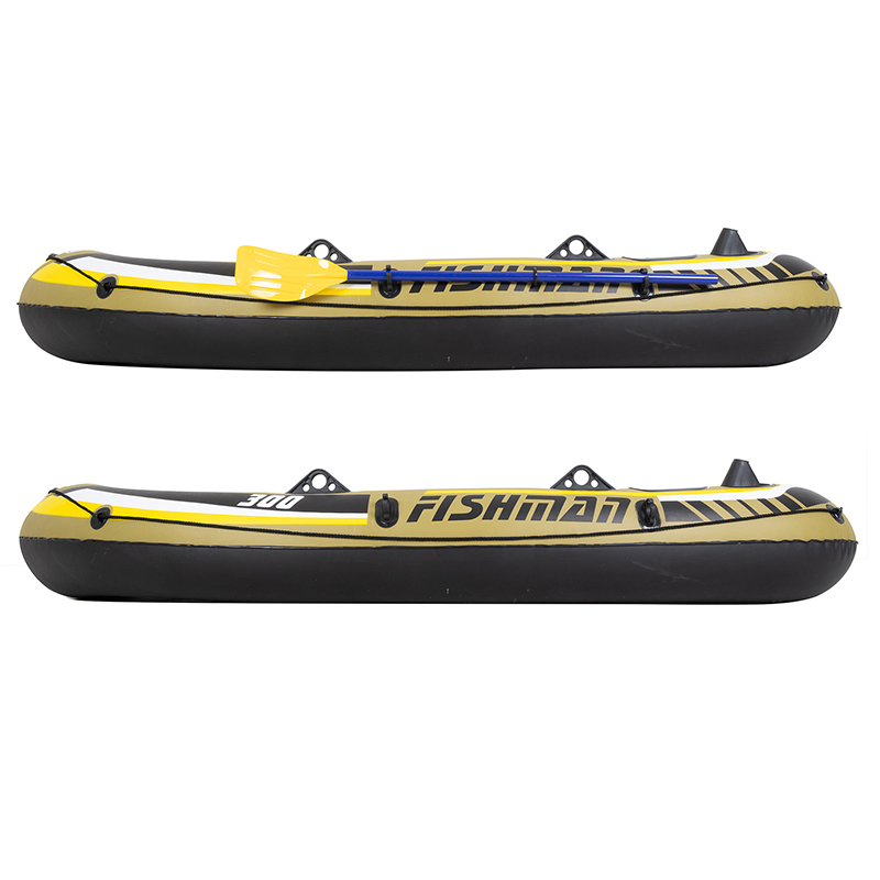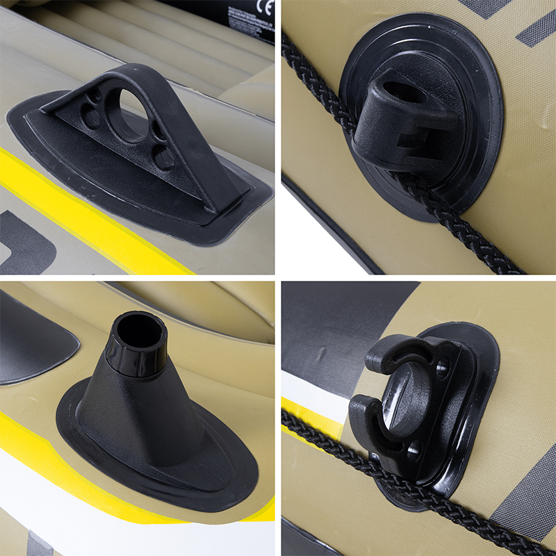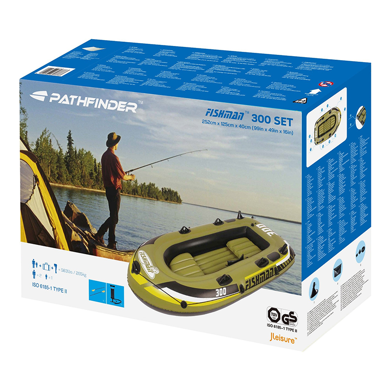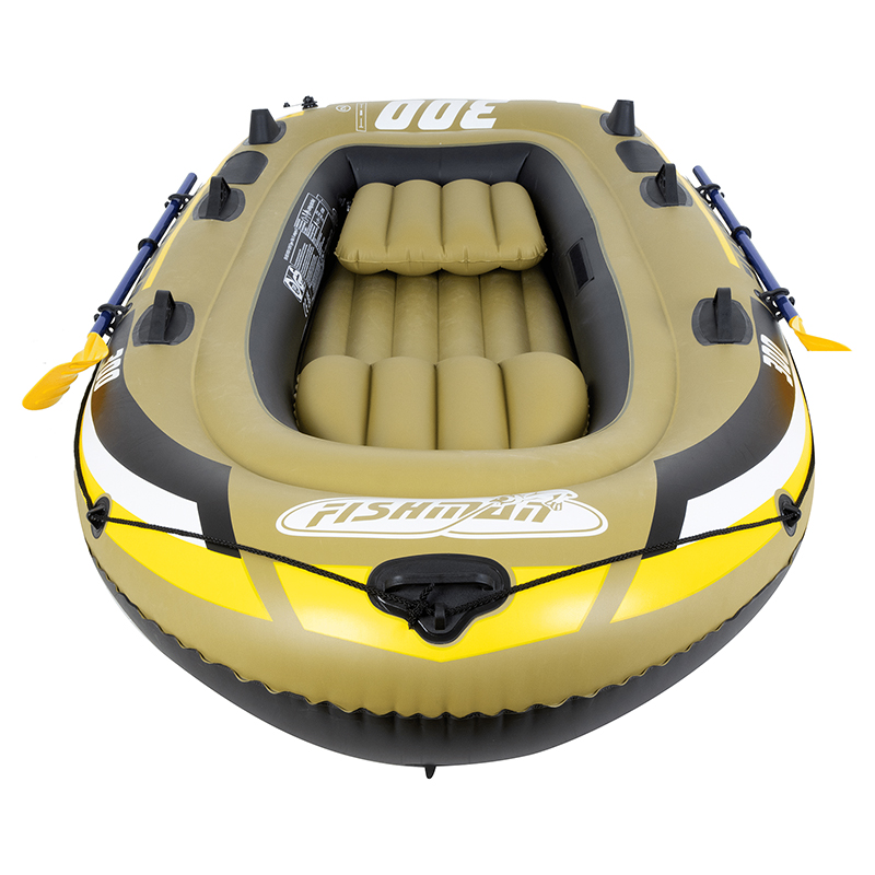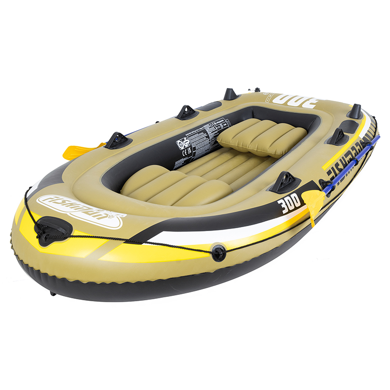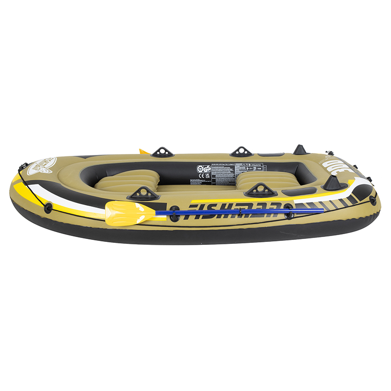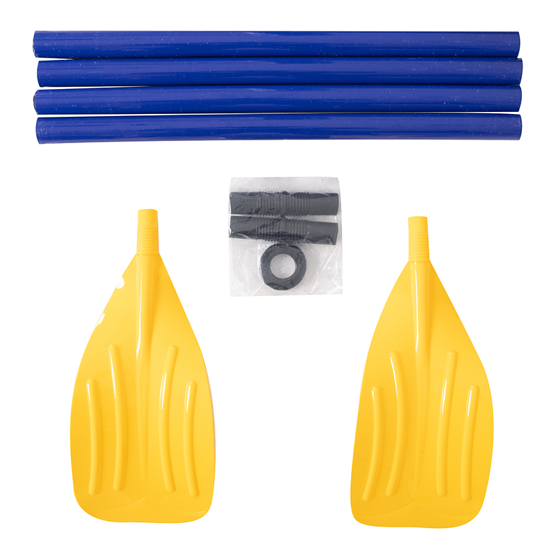 Include: 2 vâsle, pompă, frânghie de remorcare, suporturi pentru vâsle, 2 suporturi pentru undiţe, geantă, kit de reparaţii, 2 perne gonflabile pentru scaune