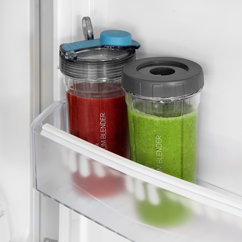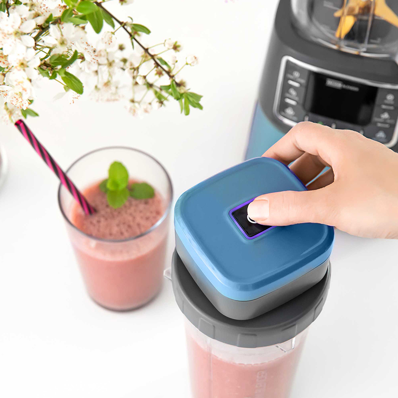 Are o unitate speciată de vidat care, atunci când este conectată, aspiră aerul din recipient şi apoi mixează ingredientele. Vidul poate păstra alimentele proaspete timp de câteva ore! Nu există oxidare şi pierdere de vitamine sau minerale, iar băutura îşi păstrează gustul chiar şi după câteva ore.