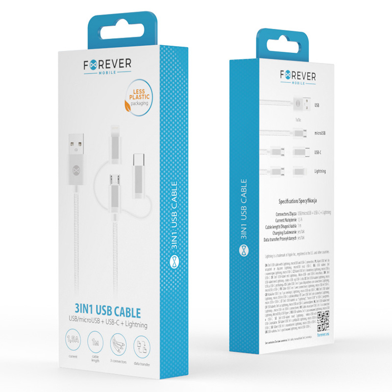 Cablu universal 3 în 1 conceput pentru conectarea smartphone-urilor la un încărcător sau la un computer. Potrivit pentru încărcarea bateriilor și transferul de date în dispozitive echipate cu porturi micro-USB, Type C și Lightning. Datorită designului său, este rezistent la încurcare. Împletitura de nailon aplicată pe întreaga lungime rigidizează și protejează cablul de deteriorări mecanice.