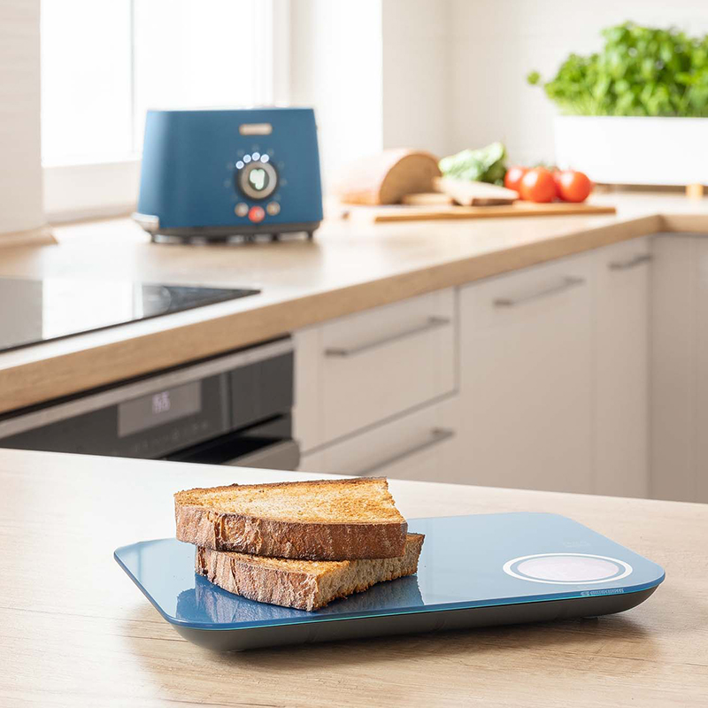 Conectarea cântarului cu telefonul mobil prin Bluetooth este incredibil de rapidă, intuitivă şi uşoară. Practic imediat, veţi vedea pe ecranul smartphone-ului (şi nu contează dacă preferaţi un dispozitiv Android sau iOS) greutatea măsurată, apoi pur şi simplu introduceţi produsul pe care îl cântăriţi pentru a vedea instantaneu cât zahăr, grăsime, energie etc. conţine alimentul respectiv.