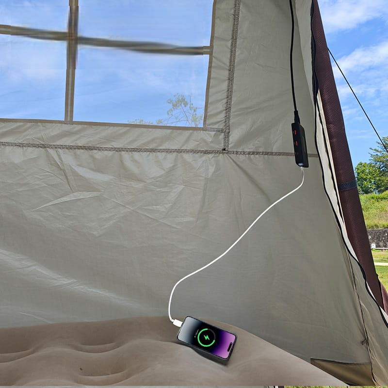 Cortul este echipat cu o baterie de 2000mAh / 7.4V / 14.8Wh şi diverse porturi de ieşire: