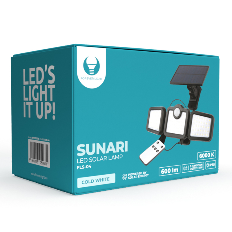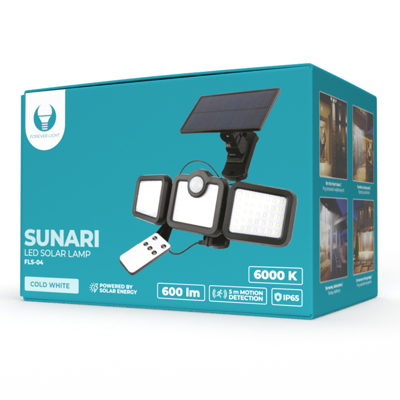 Lampă solară Forever Light Sunari FLS-04 cu senzor de mișcare PIR, care are multe funcții și caracteristici care vă permit să iluminați eficient diverse locuri, inclusiv uși din față, șoprone, grădini, balcoane, fațade etc.