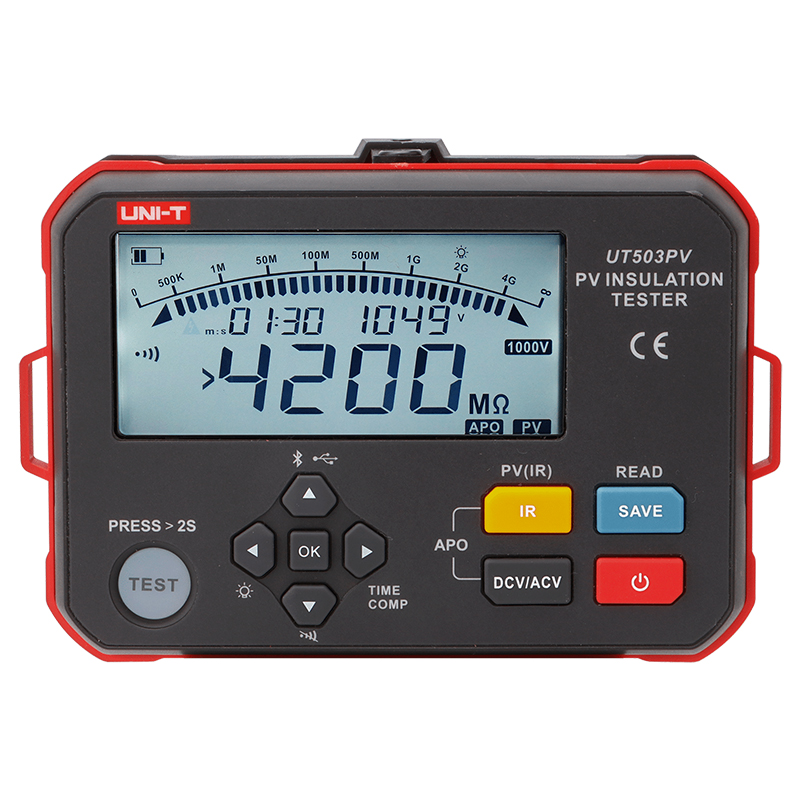 Testerul digital de rezistenţă a izolaţiei UT503PV poate fi utilizat pentru a măsura rezistenţa de izolaţie cu sursa de alimentare fotovoltaică (maxim: 1000V DC) şi rezistenţa de izolaţie convenţională (fără alimentare) şi pentru a identifica automat tensiunea AC/DC. Are mai multe funcţii, printre care: măsurarea rezistenţei de izolaţie fotovoltaică fără panou solar în timpul întreruperii de curent/scurtcircuit sau noaptea, gradarea tensiunii, transmisie Bluetooth, descărcare automată, avertizare de înaltă tensiune, funcţionare a cablului de testare cu telecomandă etc. parametri:
