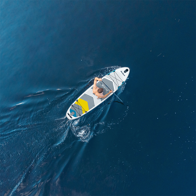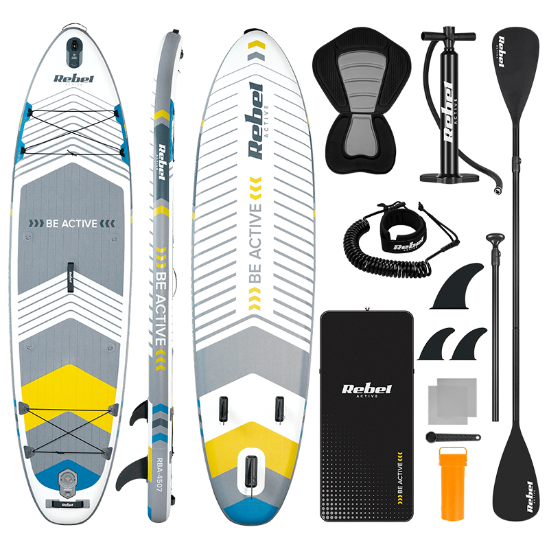Setul include: 3 x aripioare, cordon de siguranţă, vâslă, scaun caiac, pompă de mână, rucsac de transport, kit de reparaţii