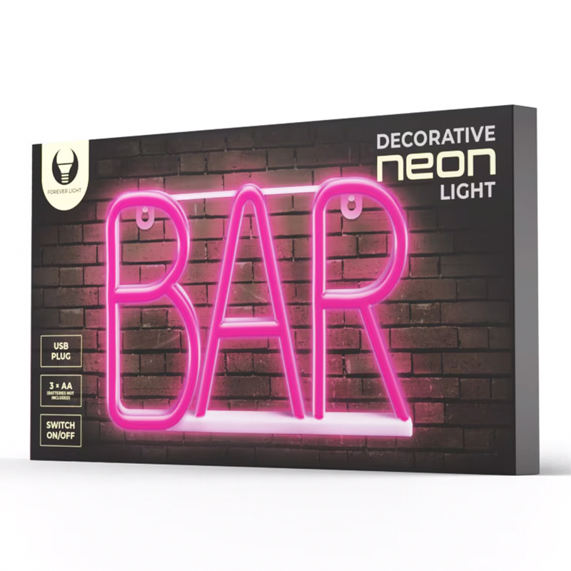 Semnul cu neon LED BAR este un decor care va fi perfect pentru baruri. Decorul LED neon strălucește cu un flux luminos de 5 lumeni și atrage atenția celorlalți, mai ales în orele de seară, așa că merită să îl folosiți într-un loc vizibil, de exemplu pe fereastra incintei. Produsul este alimentat prin USB sau baterii 3xAA. Dimensiuni 19x2x28.5cm.