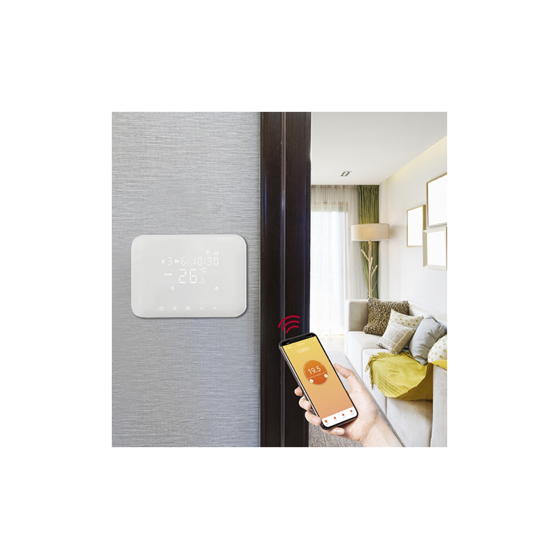 Termostat inteligent WI-FI cu panou tactil alb, iluminat din spate.